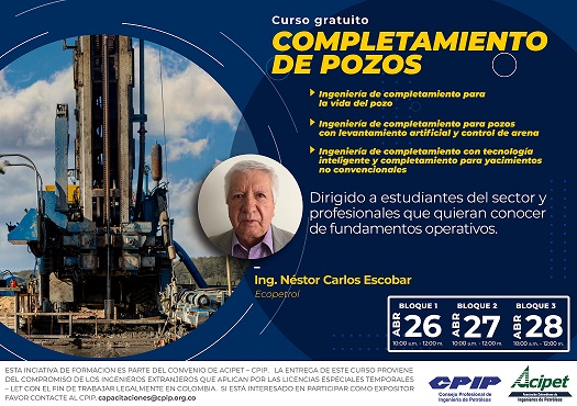 El día 28 de abril, en cumplimiento del compromiso que adquieren los Ingenieros Extranjeros para obtener su permiso para laborar en Colombia, el Ingeniero Nestor Carlos Escobar, presentó los video de capacitación en 3 bloques, acerca de Completamiento para la vida del pozo.